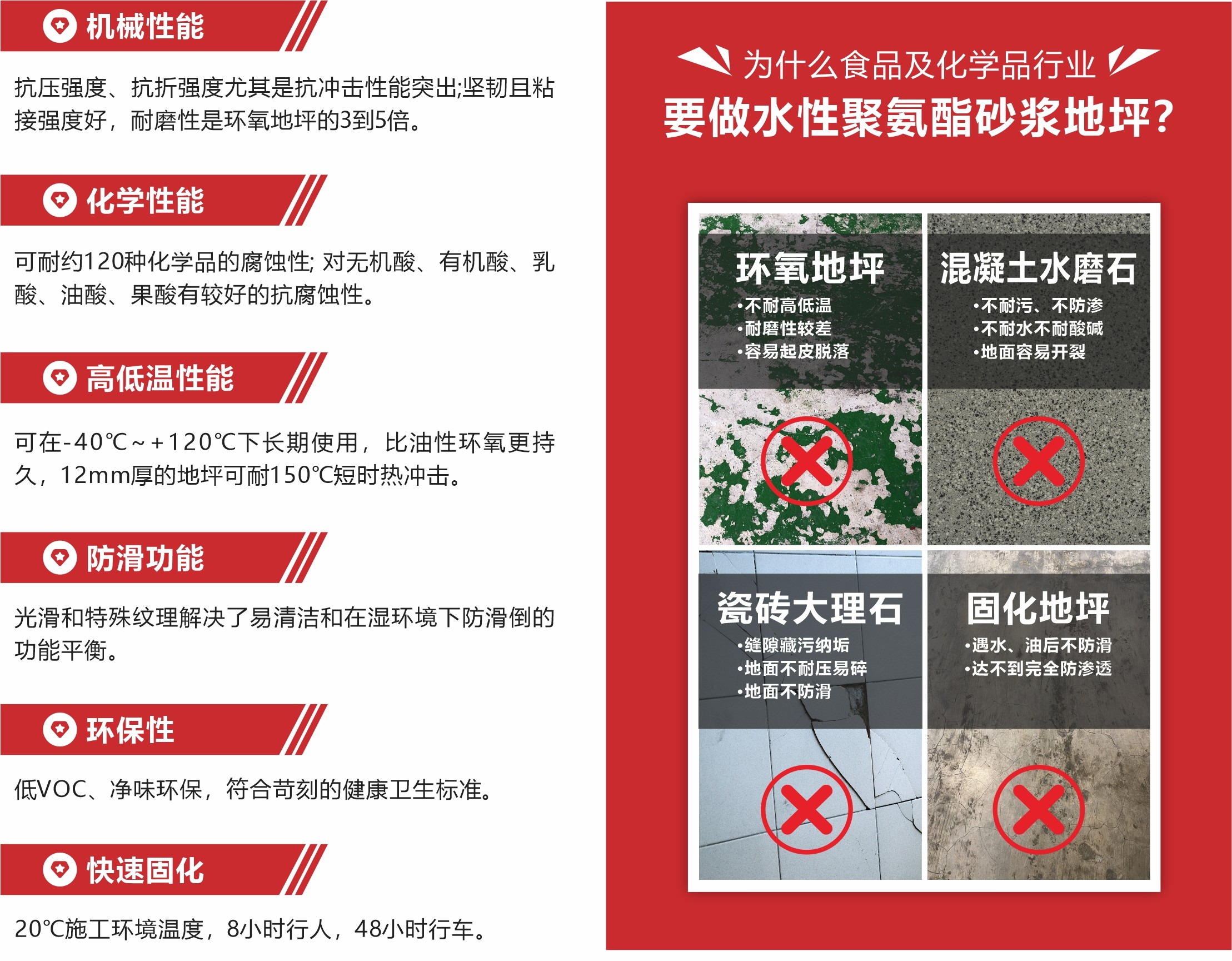 水性聚氨酯砂漿地坪系統自上世紀70年代在歐美誕生應用至今,全球數百萬平方米的案例證明其具有獨特的高性能,特別適合在食品衛生、化學品腐蝕、高溫濕熱、水浸濕滑、低溫冷凍、重載荷強沖擊的極端工業環境下使用。水性綠色,低碳環保。