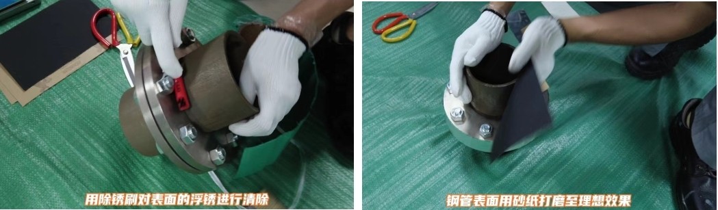 3、用布條擦拭干凈法蘭壁面(犧牲陽極與法蘭面直接接觸的面必須干凈,才能保證不影響它的導電作用),(光固化材料在施工安裝過程中要避開日光和紫外線使用,建議在避光條件下施工。)