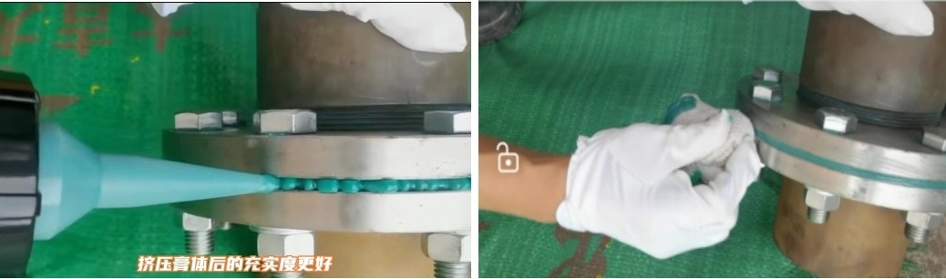 1、把粘彈體防腐膏放入打膠槍內,將打膠槍槍嘴塞入兩個法蘭間的接駁口內,槍嘴伸進去越多,擠壓后膏體才能由內向外排擠,更好的保證填充的充實度。