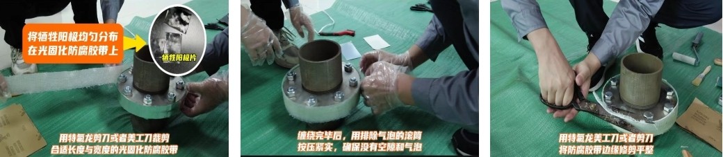 2、沿著法蘭側面纏繞,一邊纏繞一邊拉緊并按壓光固化防腐膠帶,保證沒有空隙和氣泡等,纏繞完以后再用按壓的滾筒,側面按壓一下,保證它的密實性;(光固化材料在施工安裝過程中要避開日光和紫外線使用,建議在避光條件下施工。)