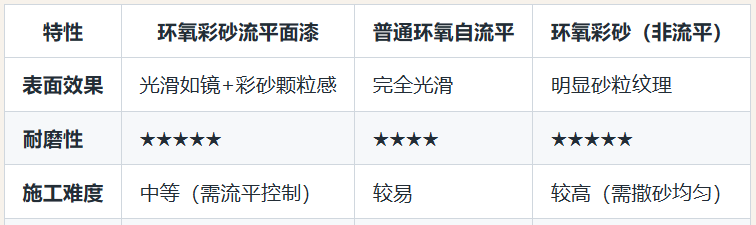 環氧樹脂+石英砂:形成高硬度涂層,抗壓、抗沖擊,適合車庫、工廠等高負荷區域。耐磨等級高:石英砂顆粒增強表面耐磨性,長期使用不易起砂、剝落。