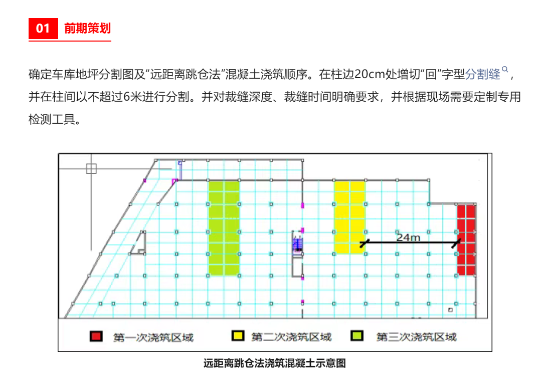 傳統(tǒng)的薄層混凝土地坪施工,施工中存在較大的質(zhì)量隱患及材料浪費(fèi),多年來(lái)車(chē)庫(kù)混凝土質(zhì)量一直沒(méi)有改觀,薄層混凝土地坪在澆筑完成后在短期內(nèi)出現(xiàn)裂縫、空鼓、起沙等質(zhì)量問(wèn)題。1、混凝土澆筑前潤(rùn)濕基層,涂刷新型聚乙烯醇界面粘合劑。在此種體系下混凝土面層與基層板面貼合緊密,有效減少了面層混凝土空鼓現(xiàn)象。2、凝土分割時(shí),在位于車(chē)庫(kù)柱邊20cm處分割一周,形成“回”字型分割,再根據(jù)柱間距離以不超過(guò)6m進(jìn)行分割。