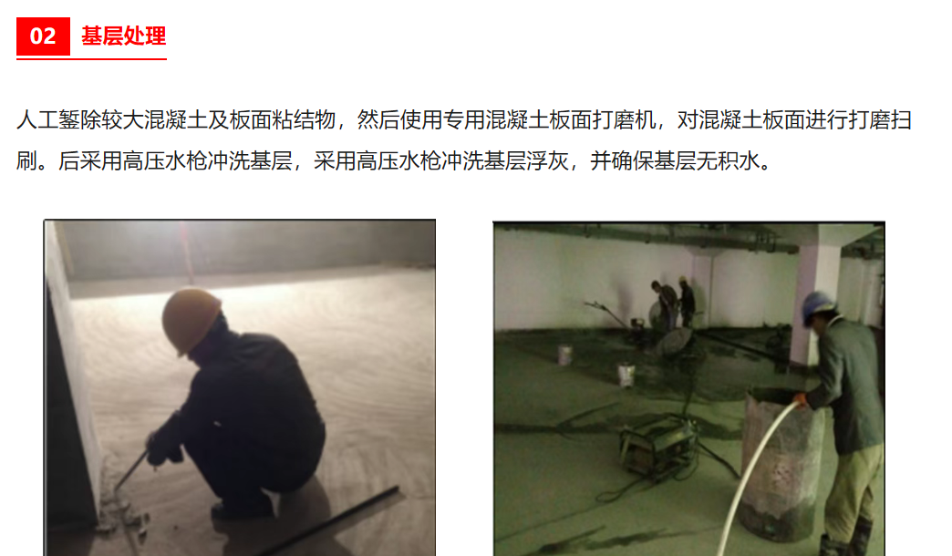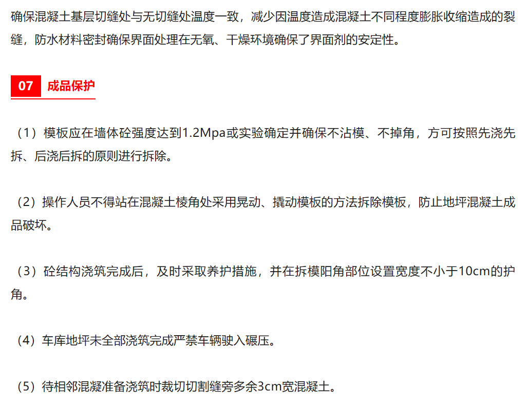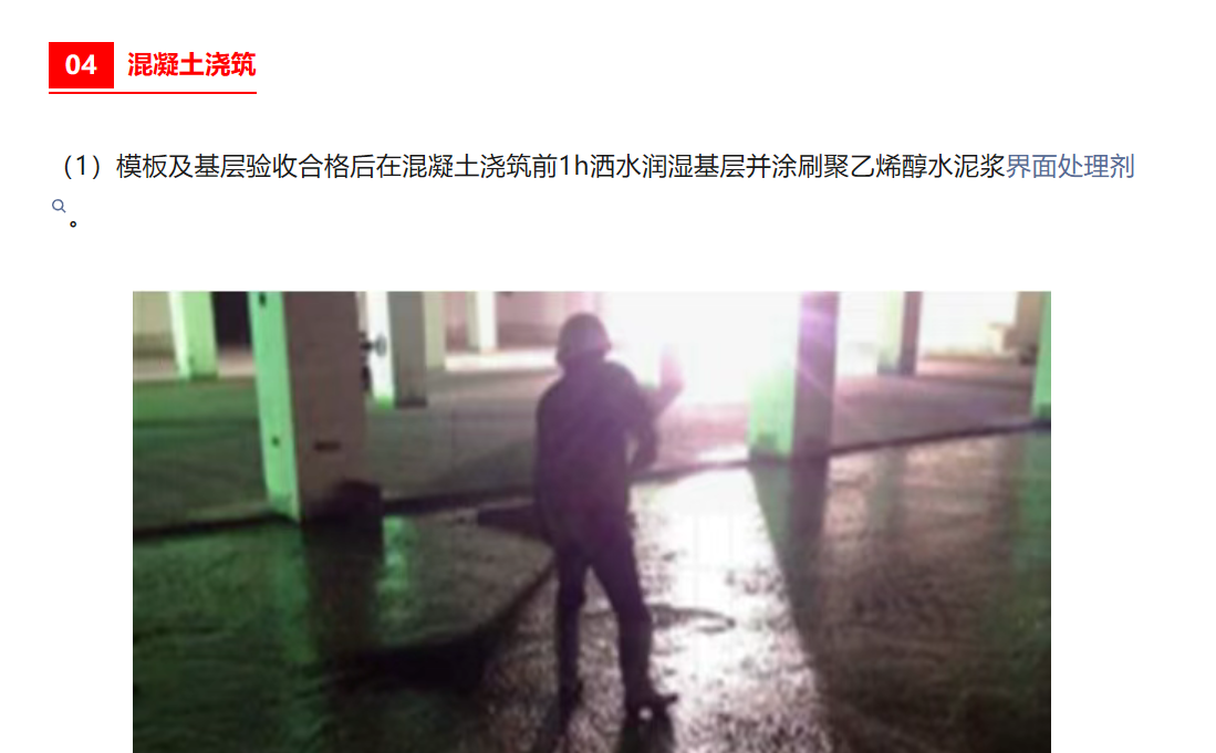 地下車(chē)庫(kù)地坪施工關(guān)鍵技術(shù):細(xì)石混凝土澆筑很重要- 混凝土澆筑前潤(rùn)濕基層后涂刷新型聚乙烯醇界面粘合劑,增加混凝土面層和基層板面的粘結(jié)度。