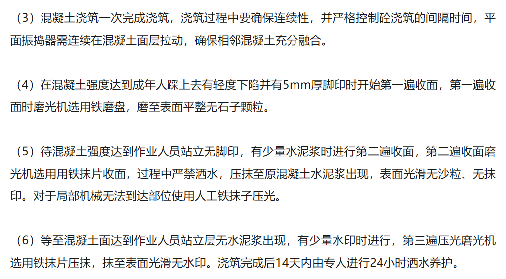 - 混凝土澆筑中使用“遠(yuǎn)距離跳倉(cāng)法”,收面三遍壓光施工。