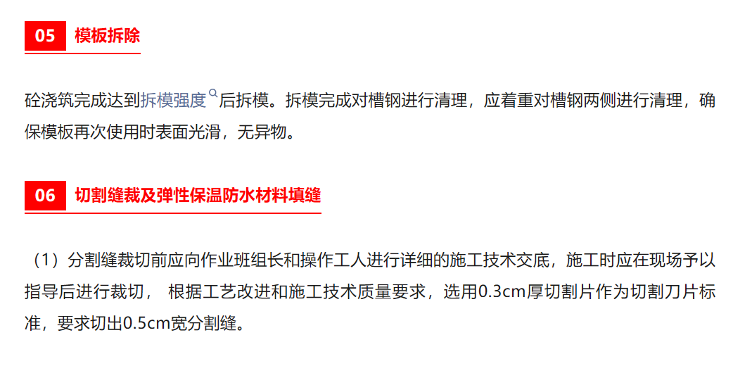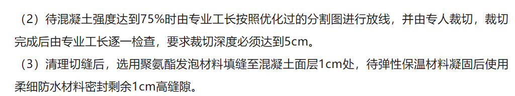 3、混凝土澆筑中使用“遠(yuǎn)距離跳倉(cāng)法”施工(第二天澆筑場(chǎng)地距第一天澆筑保持距離,確保澆筑中機(jī)械、車(chē)輛不擾動(dòng)上次澆筑的混凝土)三遍壓光施工。“遠(yuǎn)距離跳倉(cāng)法”避免因澆筑中車(chē)輛震動(dòng)造成前期澆筑混凝土與基層板面分離造成空鼓,三遍壓光確保了混凝土密實(shí)度,及混凝土干縮造成裂縫。4、彈性保溫防水材料填縫:清理切縫后,選用聚氨酯發(fā)泡材料填縫至混凝土面層。確?;炷粱鶎忧锌p處與無(wú)切縫處溫度一致,減少因溫度造成混凝土不同程度膨脹收縮造成的裂縫,防水材料密封確保界面處理在無(wú)氧、干燥環(huán)境確保了界面劑的安定性。